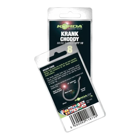 De Krank Choddy heeft een geveegde gebogen schacht, een snavelvormige, enigszins verschoven punt, naar buiten gedraaid oog en een zeer brede opening. Perfect voor ‘chod’, ‘hinge’ of stijve haaklengtes.
