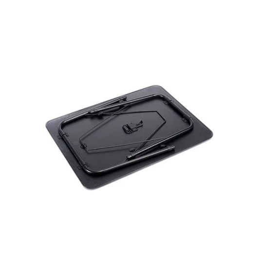Voorzien van een sluiting die de poten bijeen houdt bij het opbergen en het opzetten om plat te transporteren en voor de stabiliteit.