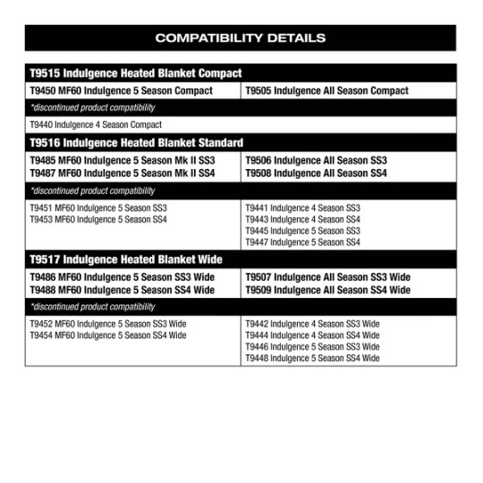 Heated Blankets zijn verkrijgbaar voor de Indulgence Compact, Standard en Wide Sleep Systems. Bekijk de details van de compabiliteit onder de Technische Specificaties